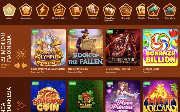Το λόμπι καζίνο περιλαμβάνει 5.000 παιχνίδια σε φρουτάκια, live casino, παιχνίδια τραπεζιού και γρήγορες μορφές. Θα βρείτε τίτλους από στούντιο όπως Hacksaw Gaming, Play’n GO, BGaming, Iconic21, Evoplay, Gaming Corps, Fantasma Games, Betsoft, Playtech και Spinomenal. Παραθέτουμε επίσης κατηγορίες όπως Μπλάκτζακ, Ρουλέτα, Πόκερ, Game Shows, Μπακαρά, Κραπς, Sicbo, Μπίνγκο, Ξυστό και Ζάρια.